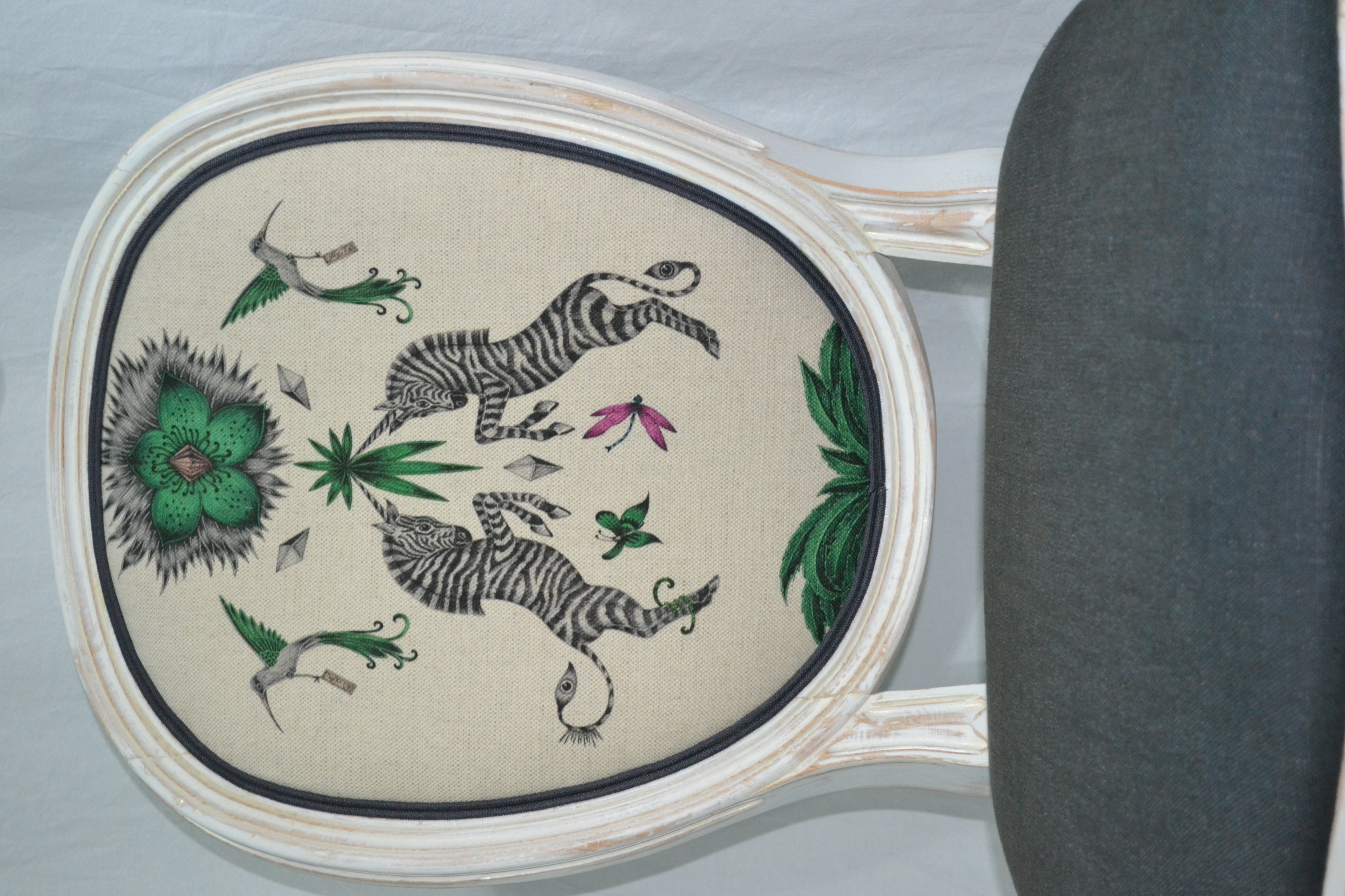 Un brin d’originalité bien maitrisée par la combinaison d’un tissu anti-tâche Luciano Marcato et de beau Créatura de la maison Clarke & Clarke.